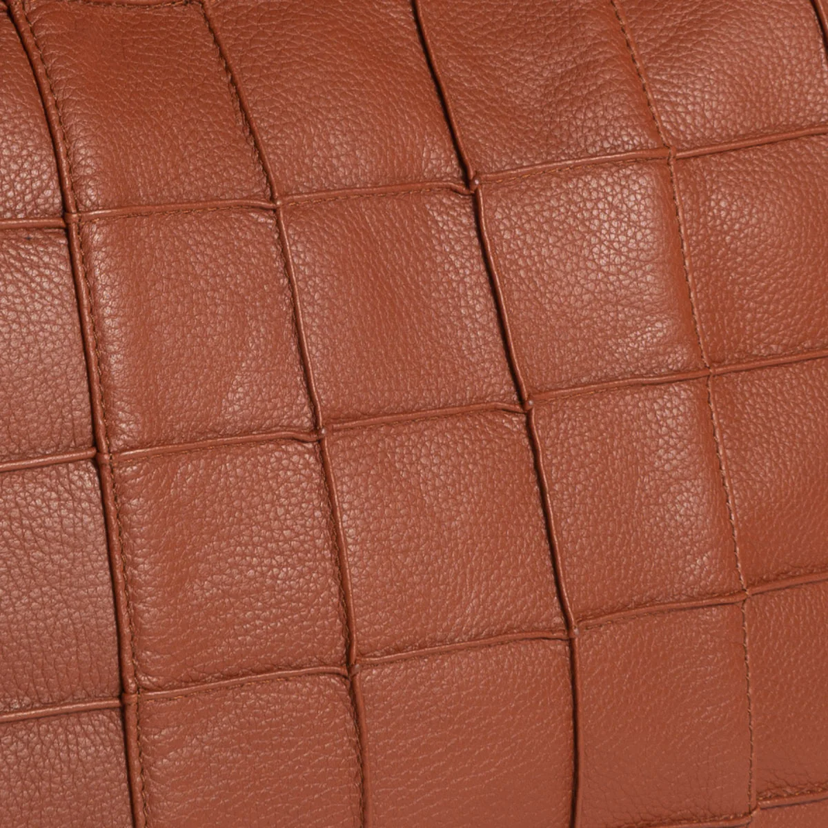 The Boho Bag is made of Nappa leather with the Large Manhattan square pattern on the outside. It has two carrying options: The shoulder handle or a longer shoulder strap. The lining is made of vibrant orange Cordura fabric with a key strap in leather, two pockets that fit a cellphone, and one zipper pocket on the side. The bag has five metal studs in the bottom. It has an open interior with room for all your daily essentials and space enough for a 13" laptop.