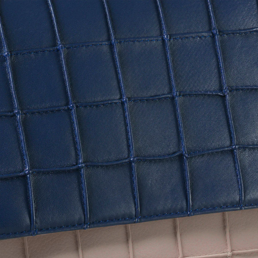 The Business Bag is made of Nappa leather with the Manhattan square pattern on every side on the outside and shiny silver-colored hardware. It has two carrying options: the artisanal leather handle with the Manhattan squares and an adjustable crossbody strap in leather. The lining is made of magenta-colored leather and has one zipper pocket on the inside and a midsection with two pockets. The bag has metal studs in the bottom to avoid direct contact with the leather when standing on any surface. The model can fit an IPad.