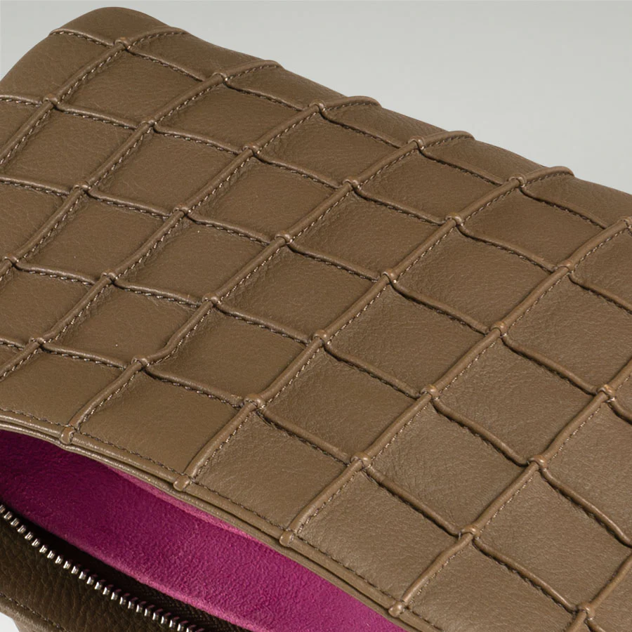 The Clutch Bag is made of smooth Nappa leather with the Manhattan square pattern on the outside and shiny silver hardware. It has two carrying options: holding it in your hand or using the adjustable crossbody strap in leather. The lining is made of Magenta-coloured leather and there is one interior pocket.