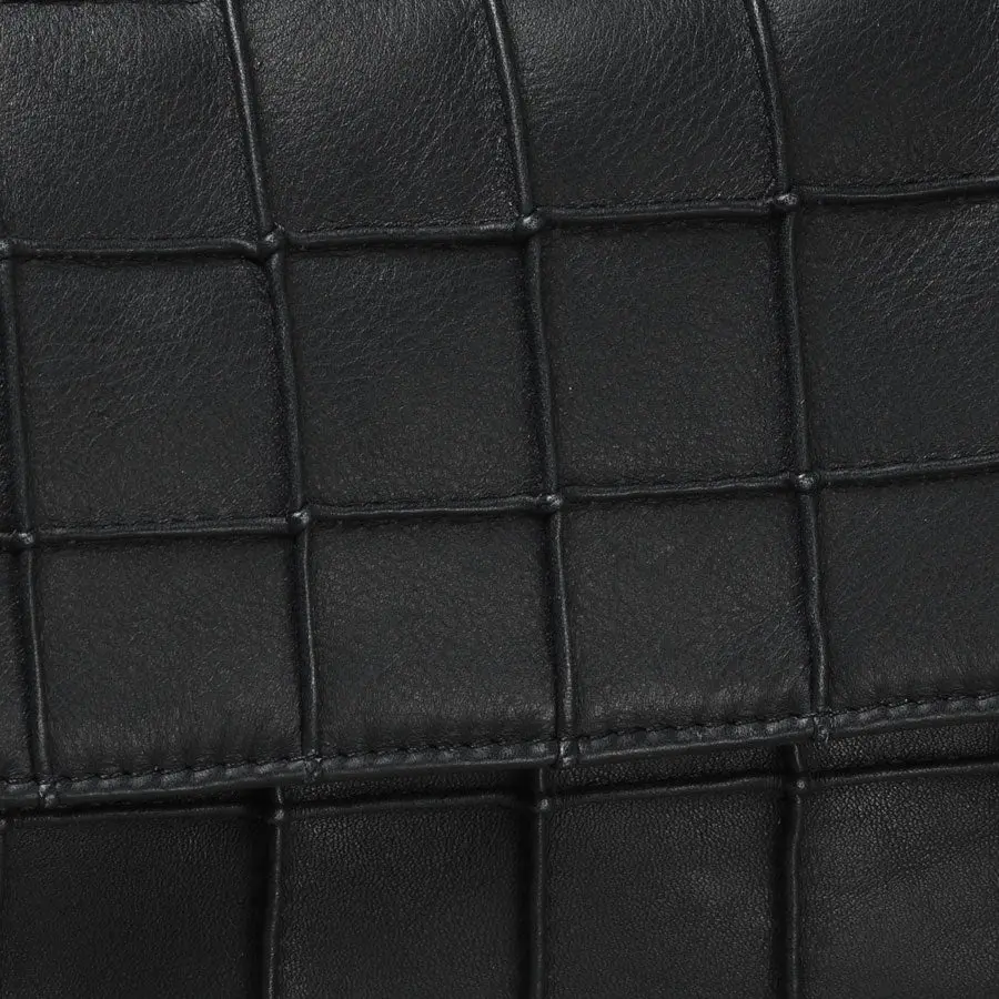 The Dinner Bag is made of Nappa leather with the Manhattan square pattern on every side on the outside and shiny silver-colored hardware. It has two carrying options: the artisanal leather handle with the Manhattan squares and an adjustable crossbody strap in leather. The lining is made of magenta-colored leather and has one zipper pocket on the inside and a midsection with two pockets. The bag has metal studs in the bottom to avoid direct contact with the leather when standing on any surface.