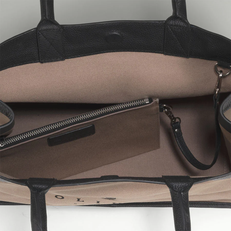 The Jet Set Tote bag in sandcastle beige organic cotton and charcoal black leather.