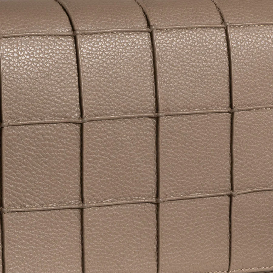 The Madison Bag is made of Nappa leather with the Manhattan square pattern on the outside and shiny silver-colored hardware. It has two carrying options: the leather handle and the adjustable crossbody/ shoulder strap in leather. The lining is made of orange-colored Cordura and has one zipper pocket and one open pocket on the inside. It has a key strap in leather.