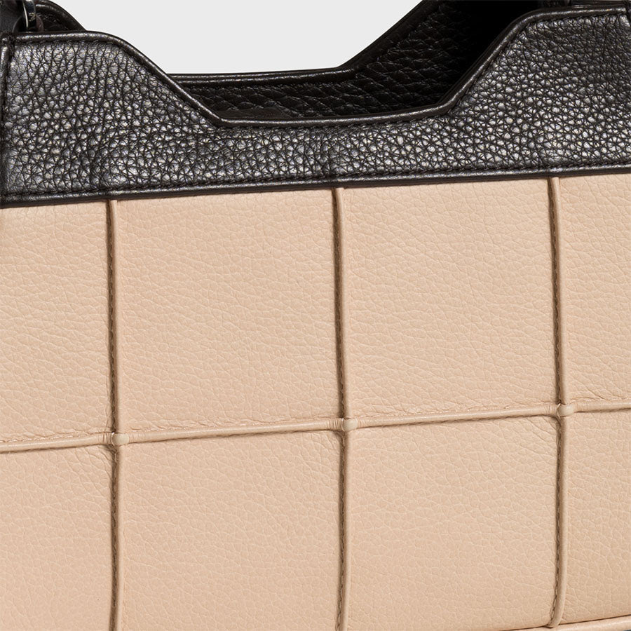Monica Cocktail bag in Ivory leather, brown leather, and passion orange Cordura lining.
